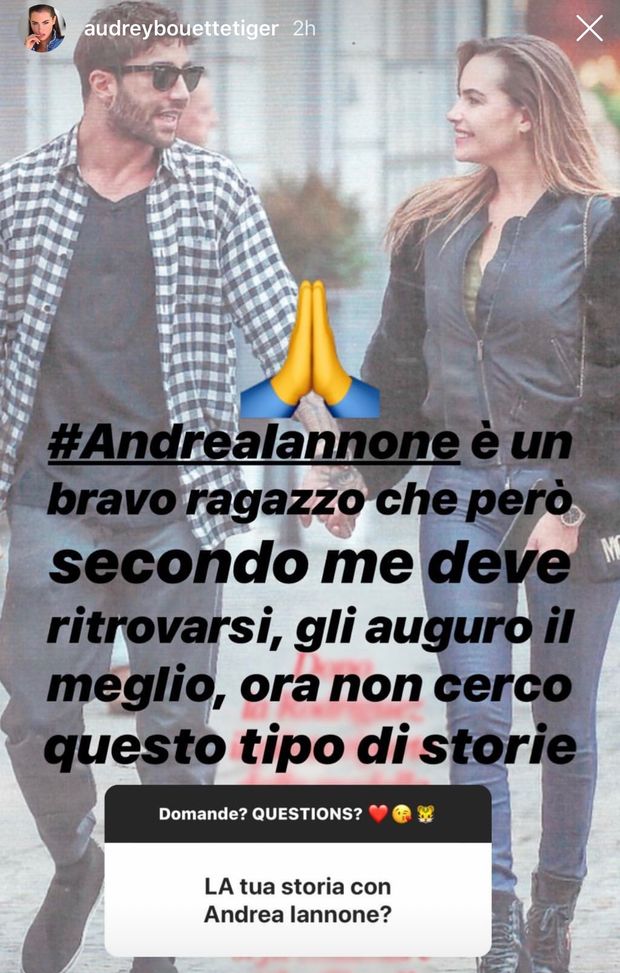 La voce che Andrea Iannone avesse definitivamente archiviato Belen Rodriguez con la modella Audrey Bouette, testimonial di Dior ed ex ombrellina, risale proprio a questi giorni. La rivista Chi ha pubblicato anche alcune dichiarazioni del pilota di moto GP che raccontava di avere finalmente trovato la serenità. Ma Audrey ha smentito tutto con una Instagram Stories in risposta alla curiosità dei suoi follower: "Andrea Iannone è un bravo ragazzo che però secondo me deve ritrovarsi, gli auguro il meglio. Ora non cerco questo tipo di storie".