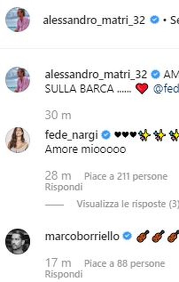 Alessandro Matri posta un bacio appassionato con la sua Federica mentre si godono le vacanze in barca. L'attaccante del Sassuolo e l'ex velina sembrano sempre innamoratissimi. Insieme hanno una famiglia bellissima, due bimbe sono nate dal loro amore e sono una delle coppie più seguite da chi ama gossip e calcio. Il giocatore ha condiviso su Instagram la foto del loro bacio in barca e pure Borriello si è preso la briga di commentare, con tre violini.