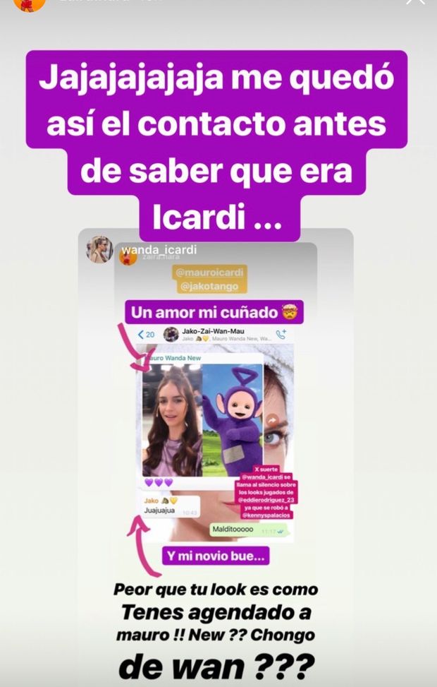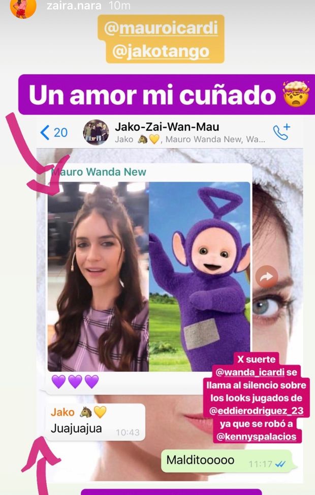 Il look condiviso da Zaira Nara su Instagram non ha convinto Mauro Icardi, marito della sorella Wanda. Il giocatore dell'Inter ha così deciso di accostarlo a quello di un noto cartone animato, i Teletubbies, con un collage che ha fatto indispettire l'argentina. "Un amore di cognato", ha commentato Zaira. Il compagno di Zaira è scoppiato a ridere, la sorella di Wanda ha pubblicato la chat nelle sue Instagram Stories.