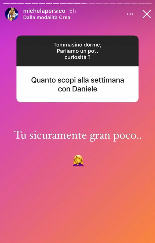 Sui prossimi impegni relativi alla sua carriera la Persico ha preannunciato novità: "Quest'anno con la nascita di Tommy, il trasferimento in Francia e il Covid, è stata un a grande fortuna poter comunque lavorare seppur in modo non continuativo come negli anni precedenti... ma da settembre grandi news!". Michela ha anche risposto ad una domanda decisamente fuori luogo: