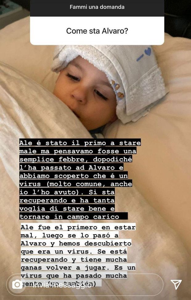 "Ale (il bambino) è stato il primo a stare male ma pensavamo fosse una semplice febbre, dopodiché l'ha passato ad Alvaro e abbiamo scoperto che è un virus (molto comune, anche io l'ho avuto). Sì, sta recuperando e ha tanta voglia di stare bene e tornare in campo carico", ha spiegato Alice Campello sui social.