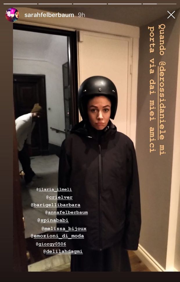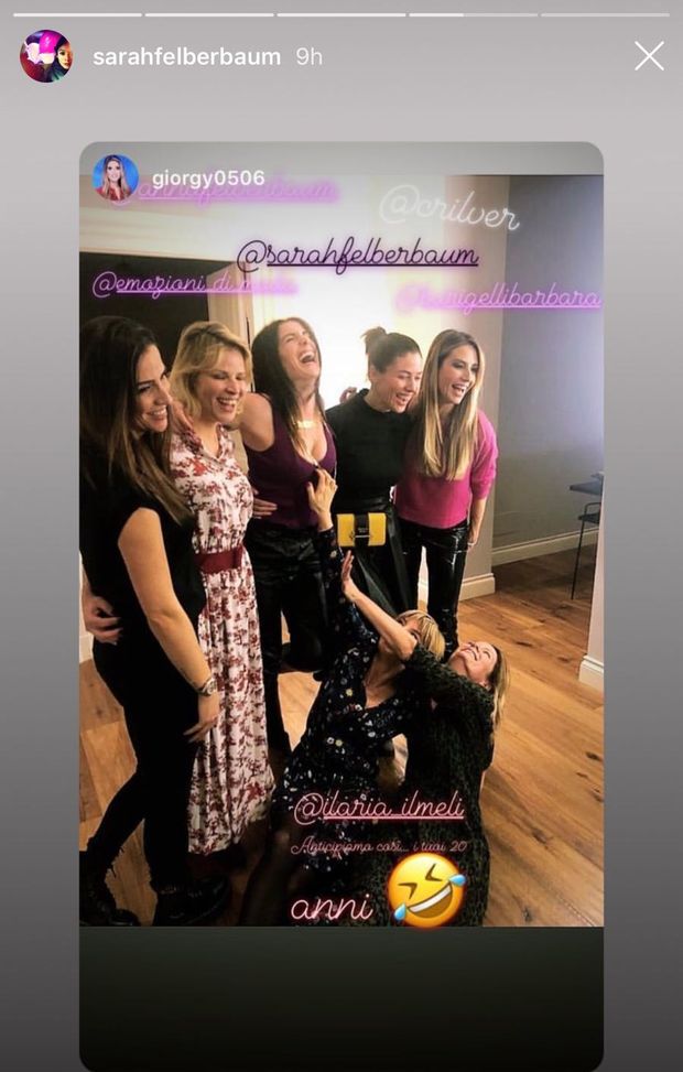 Serata di festa per la moglie del centrocampista della Roma Daniele De Rossi. L'attrice Sarah Felberbaum si diverte assieme alle sue amiche, tra cui anche la giornalista Giorgia Rossi, in una serata in cui ha la 'libera uscita'. Ma all'improvviso arriva Daniele De Rossi a 'interrompere' la festa e la moglie Sarah non la prende benissimo. Faccia triste e questo commento: "Quando De Rossi mi porta via dai miei amici".