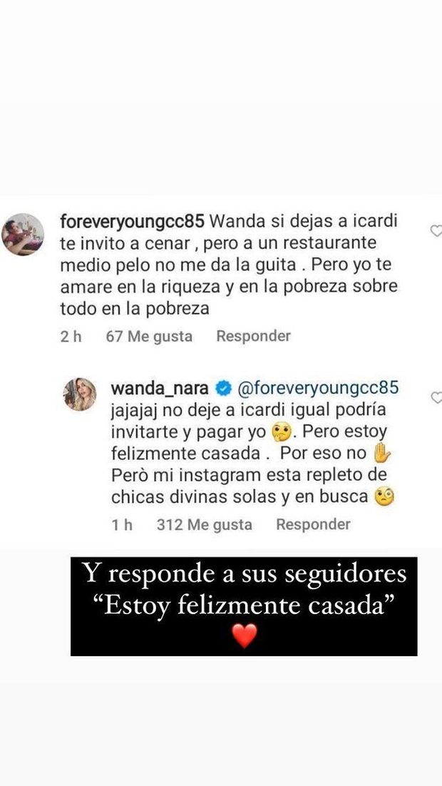"Wanda, se lasci Icardi, ti invito a cena e ti amerò nella ricchezza e nella povertà. Specialmente nella povertà", ha scritto un fan a lady Icardi. "Non ho lasciato Icardi, potrei comunque invitarti e pagare io, ma sono felicemente sposata. Ecco perché ti devo dire di no. Ma il mio Instagram è pieno di ragazze divine single e in cerca". Con questa risposta Wanda Nara mette in chiaro che non c'è nessuna crisi che disturba la sua relazione con Mauro Icardi. I due hanno condiviso anche una passeggiata nella notte con il cane sui social, anche se Wanda ha poi rimosso il video. La moglie di Icardi ha risposto ad un fan che le chiedeva di lasciare Icardi e di andare a cena con lui, ma in un ristorante non troppo caro.