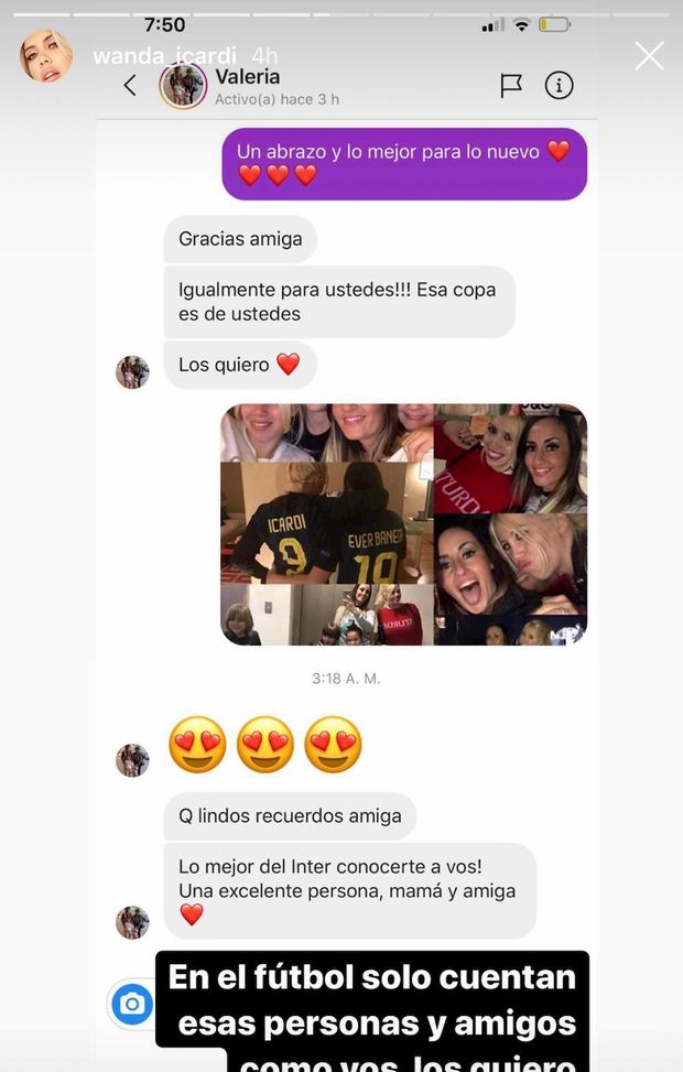 Non solo messaggi al suo Maurito ma anche a vecchie amicizie, che tornano in voga. Wanda ha infatti pubblicato una chat con la moglie di Banega nelle sue Instagram Stories. Wanda e Valeria hanno ricordato il periodo in cui erano wags nerazzurre. La compagna di Banega ha condiviso la gioia per la vittoria dell'Europa League con un pensiero: "La cosa migliore dell'Inter è stata conoscere voi!". E Banega in finale ha proprio eliminato la sua ex squadra, l'Inter...